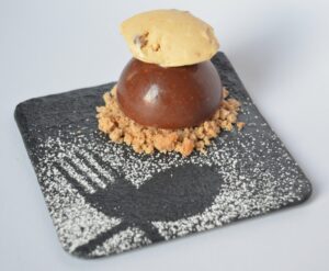 POSTRE: ‘Semiesfera de Chocolate y Avellanas’ con interior de cheesecake de crema de avellanas, un kennel de helado de turrón y sobre una cama de migas de polvorón (Postre sin lactosa)